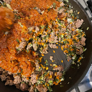 Now add the mince & vegetable mix to the tomato sauce & add the beef stock and cook for a further 5 minutes.